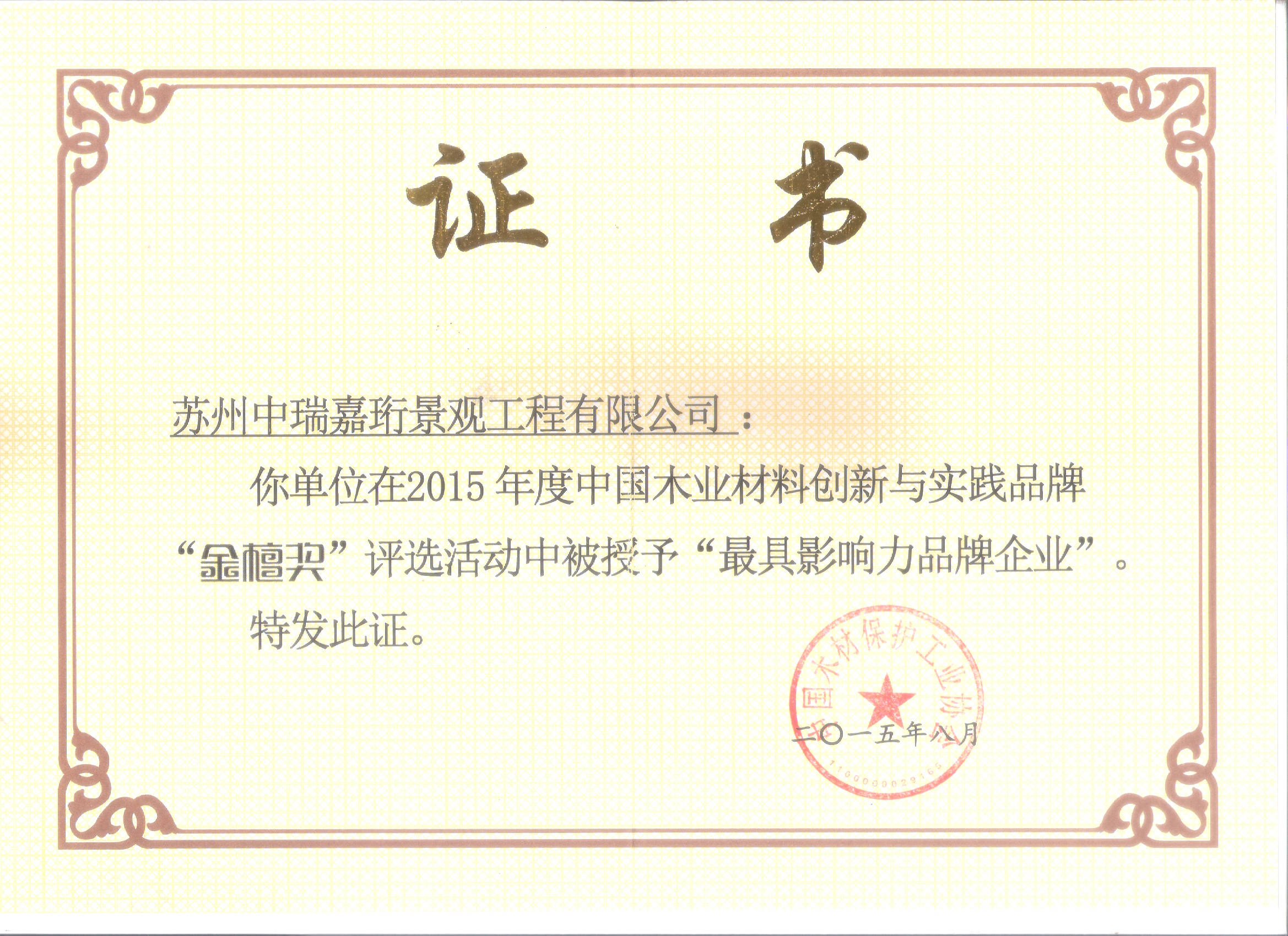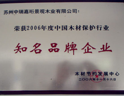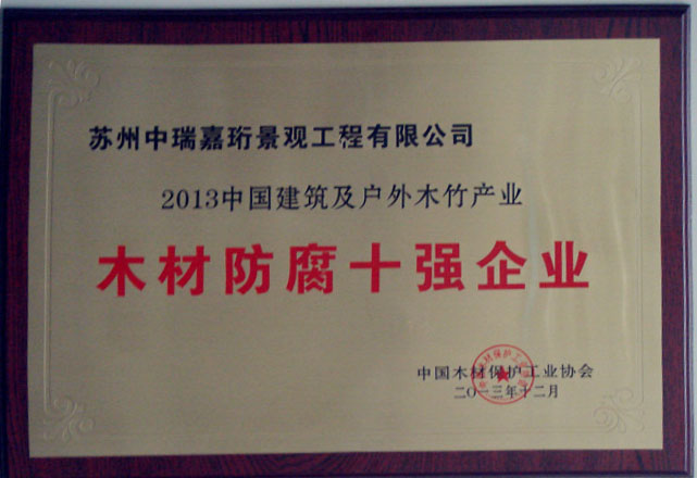 2013年在《中國木材保護工業協會》的組織下,我公司榮獲本年度防腐木企業評選《防腐木材企業十強》稱號。